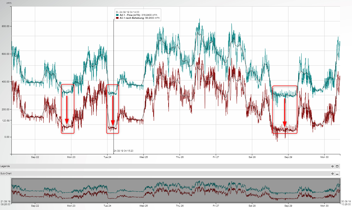 Practical tip: In order not to miss the optimum time for the Leak audit, the use of a volume flow sensor (e.g. VA 500) in the main line behind the tank is recommended. Measuring is recommended for at least one week (Monday to Sunday). In addition, the volume flow measurement can be used to validate the result of the Leakages search and repair, as this must reduce the volume flow when the system is at a standstill.