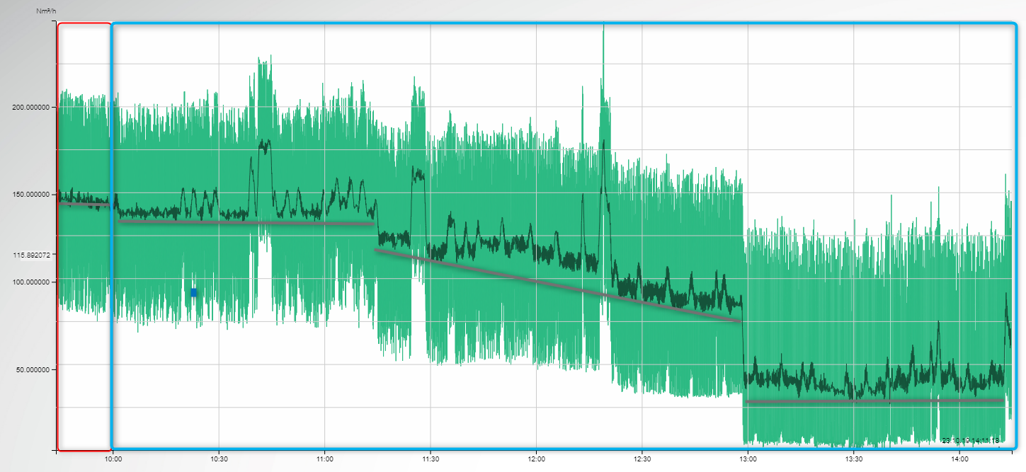 A VA 500 thermal flow sensor has been installed behind the compressed air tank to measure the consumption of the two halls. The following graphic shows the Compressor switching on and off in the original volume flow profile (light green). For better comparability, the moving average was therefore also calculated and plotted (dark green). The following findings can be derived from this: Although there was no production before 10:00 a.m., the Compressor delivers a lot of Compressed air. The real "production peaks" are very small compared to the base load. This indicates a very high Leakages rate. To confirm the assumption, the Ball valves to the machines in the shutdown area (in Hall 1) were closed so that their Leakages are no longer supplied with Compressed air. Most Leakages are typically found in and around machines. As the volume flow profile decreases steadily, it can be seen that the base load can be reduced enormously from closed ball valve to ball valve. This is an indication of the impact a leakage repair would have on the compressed air profile of this bakery.