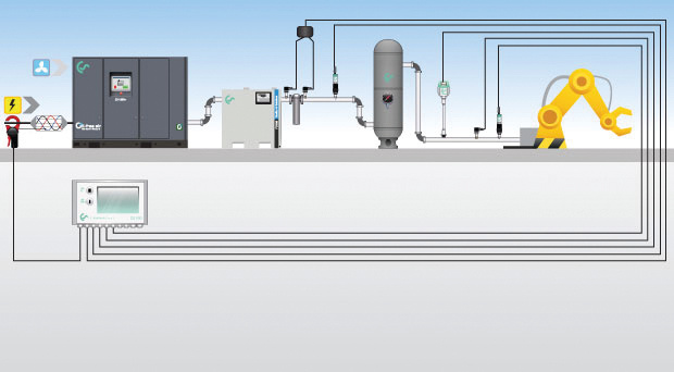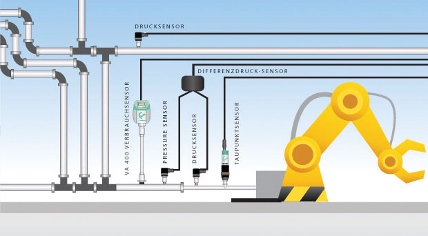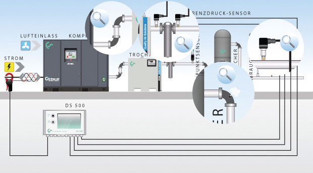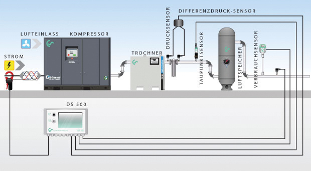 Comme illustré dans l'exemple, l'enregistreur graphique intelligent DS 500 permet de saisir et d'enregistrer la consommation d'air comprimé avec le capteur de consommation VA 500, le point de rosée ou le point de rosée sous pression avec le capteur de point de rosée FA 510, la Pression ou la consommation d'énergie avec une pince ampèremétrique CS et en plus la pression avec un capteur de pression CS, directement au niveau de la génération d'air comprimé dans la salle des compresseurs.