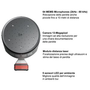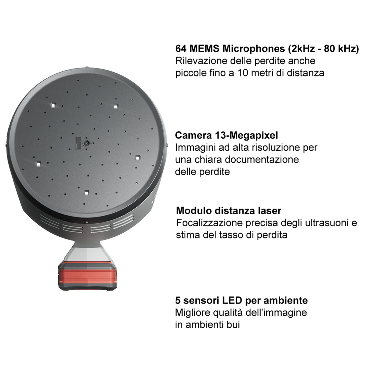 Grazie a questa tecnologia, LeakCam 600 è in grado di scansionare ampie aree senza trascurare perdite di piccole e medie dimensioni. La distanza massima di 20 cm tra i microfoni assicura inoltre un rilevamento particolarmente preciso delle perdite, anche su lunghe distanze, e garantisce una Rilevazione perdite accurata ed efficiente.