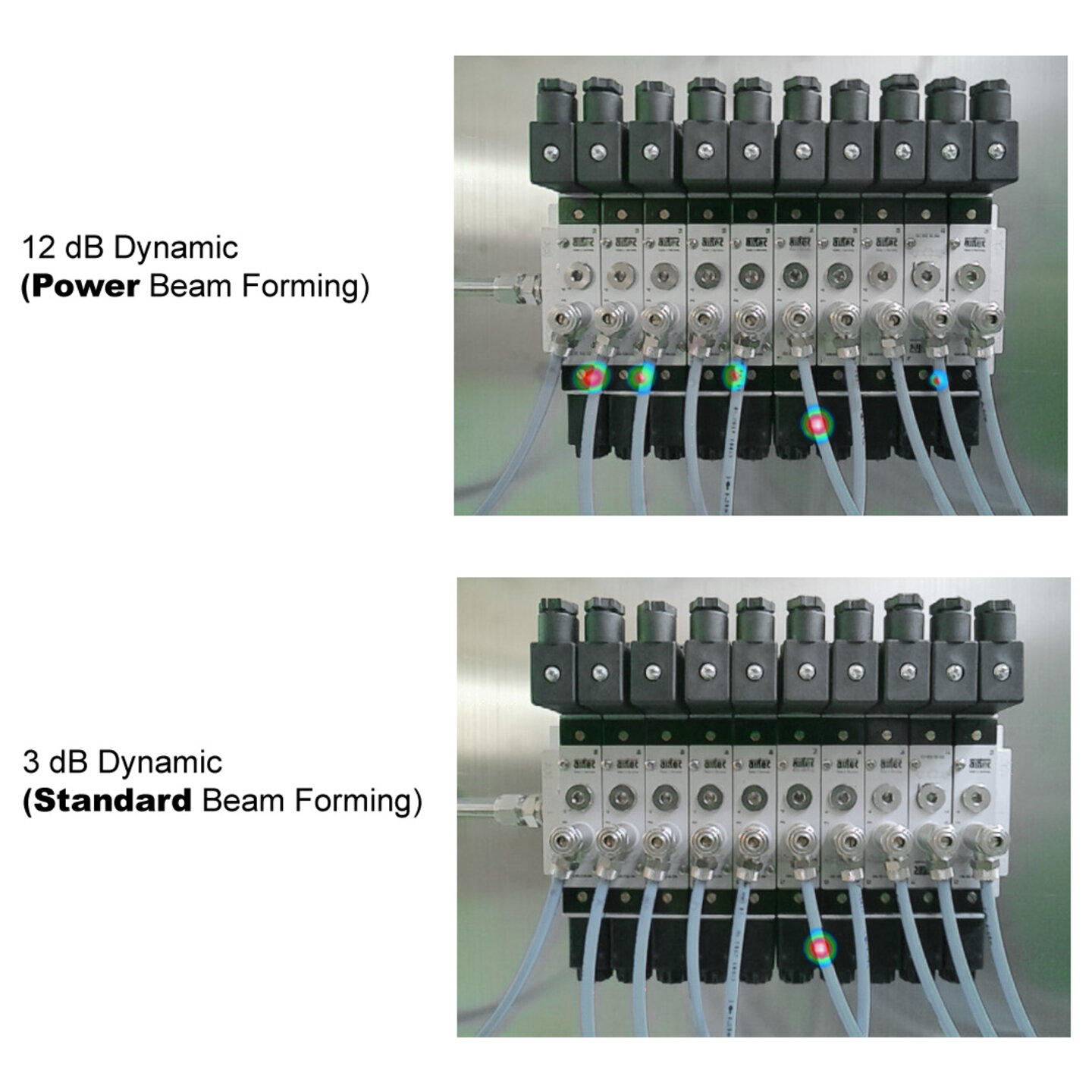 L'algoritmo Power Beamforming di LeakCam 600 utilizza i segnali di 64 Microfoni mems a ultrasuoni e le loro posizioni per localizzare più perdite contemporaneamente. Con una gamma dinamica unica di 12 dB, la LeakCam consente di rilevare simultaneamente perdite di volumi diversi, senza che le perdite più grandi o il rumore ultrasonico mascherino le perdite più piccole. La gamma dinamica descrive quindi la capacità di riconoscere sorgenti sonore di volumi diversi, senza che le sorgenti forti mascherino quelle silenziose. In confronto, i Rilevatori perdite convenzionali che utilizzano l'algoritmo standard di formazione del fascio raggiungono solo una gamma dinamica di 3 dB, il che limita fortemente la loro capacità di rilevare più perdite contemporaneamente.