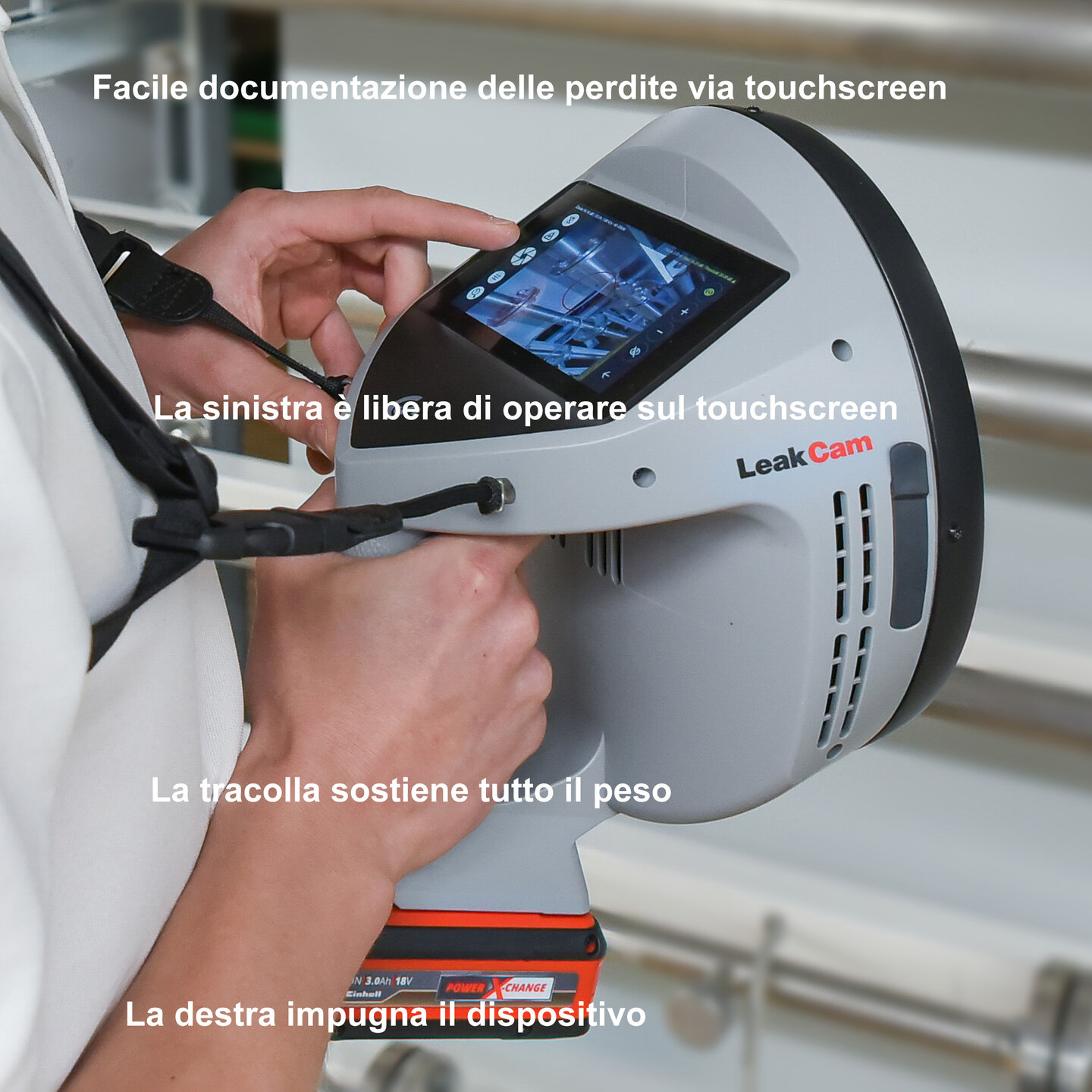 Il semplice rilevamento delle perdite di aria compressa non consente di risparmiare energia/denaro. Per ridurre il Consumo di energia, è necessario eliminare le Perdite in una seconda fase. LeakCam 600 aiuta a memorizzare informazioni importanti direttamente sulla perdita, necessarie per la riparazione: