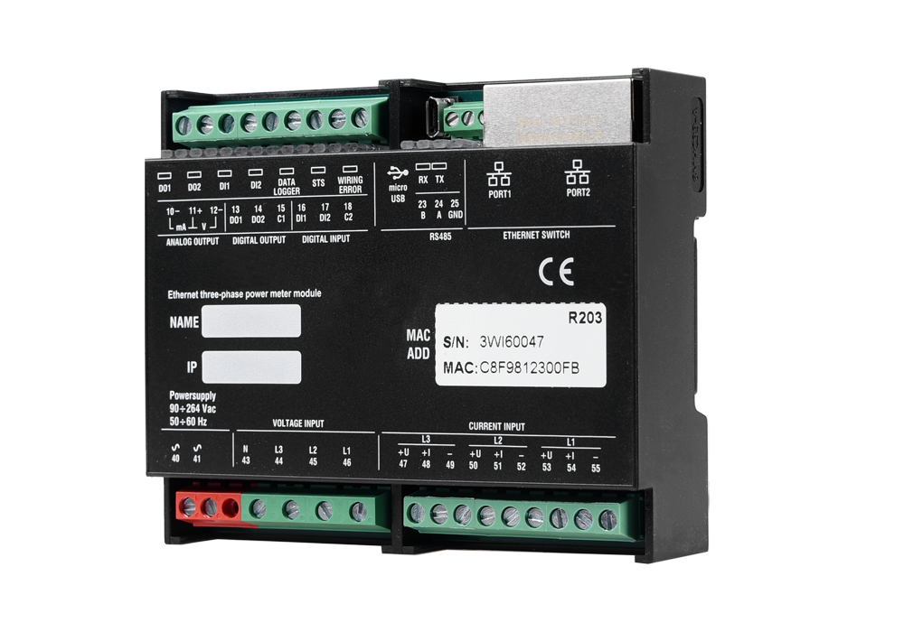 with 3 external current transformers for big machines and plants. Measures kW, kWh, cos, phi, kVar, kVA.