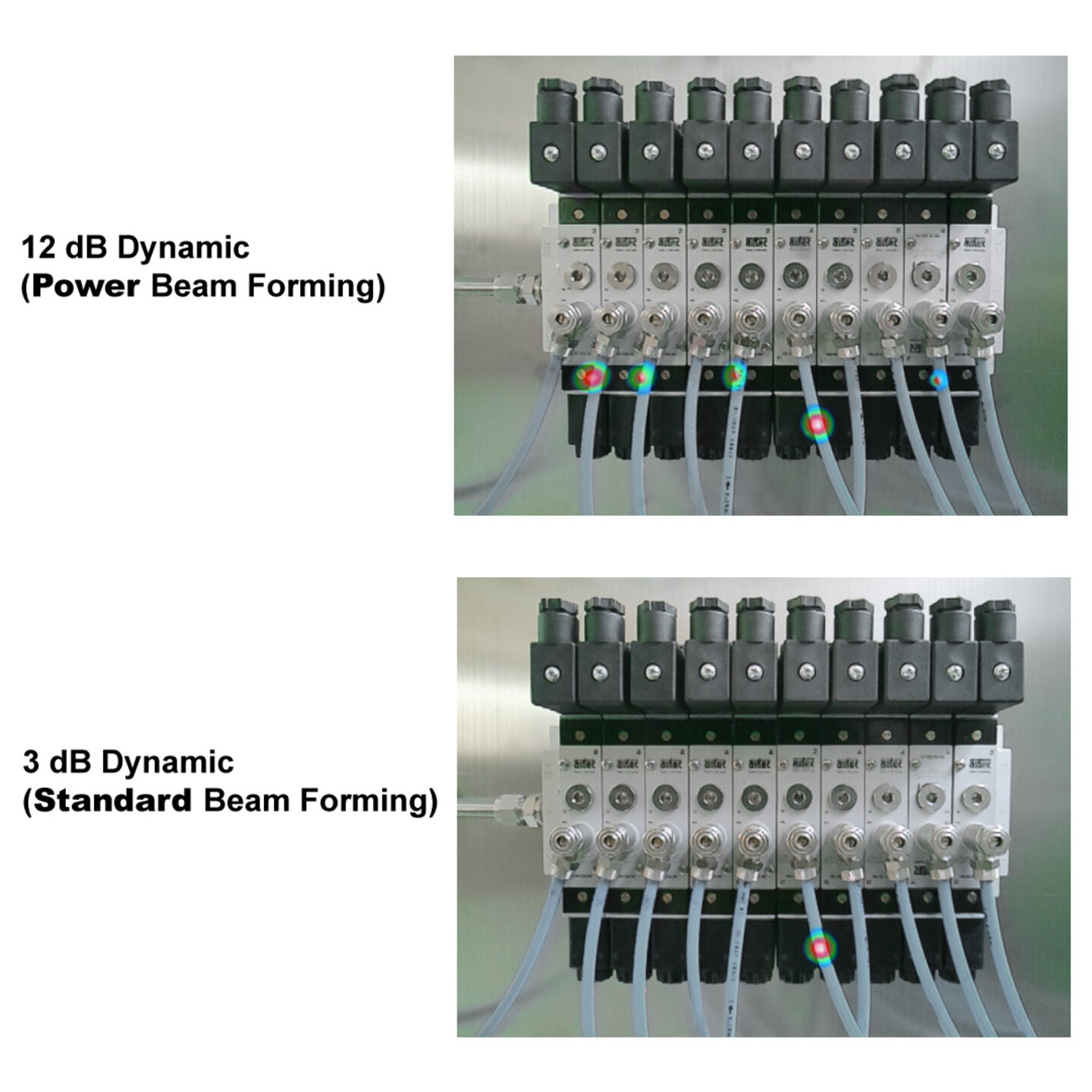 The LeakCam 600's Power Beamforming algorithm uses the signals from 64 ultrasonic MEMS microphones and their positions to locate multiple leakages simultaneously. With a unique dynamic range of up to 12 dB, the LeakCam enables the simultaneous detection of leaks of different volumes - without larger leaks or ultrasonic noise masking smaller leaks. The dynamic range therefore describes the ability to detect sound sources of different volumes without loud sources masking quiet sources. In comparison, conventional leak detectors using the standard beamforming algorithm only achieve a dynamic range of 3 dB, which severely limits their ability to detect multiple leakages at the same time.