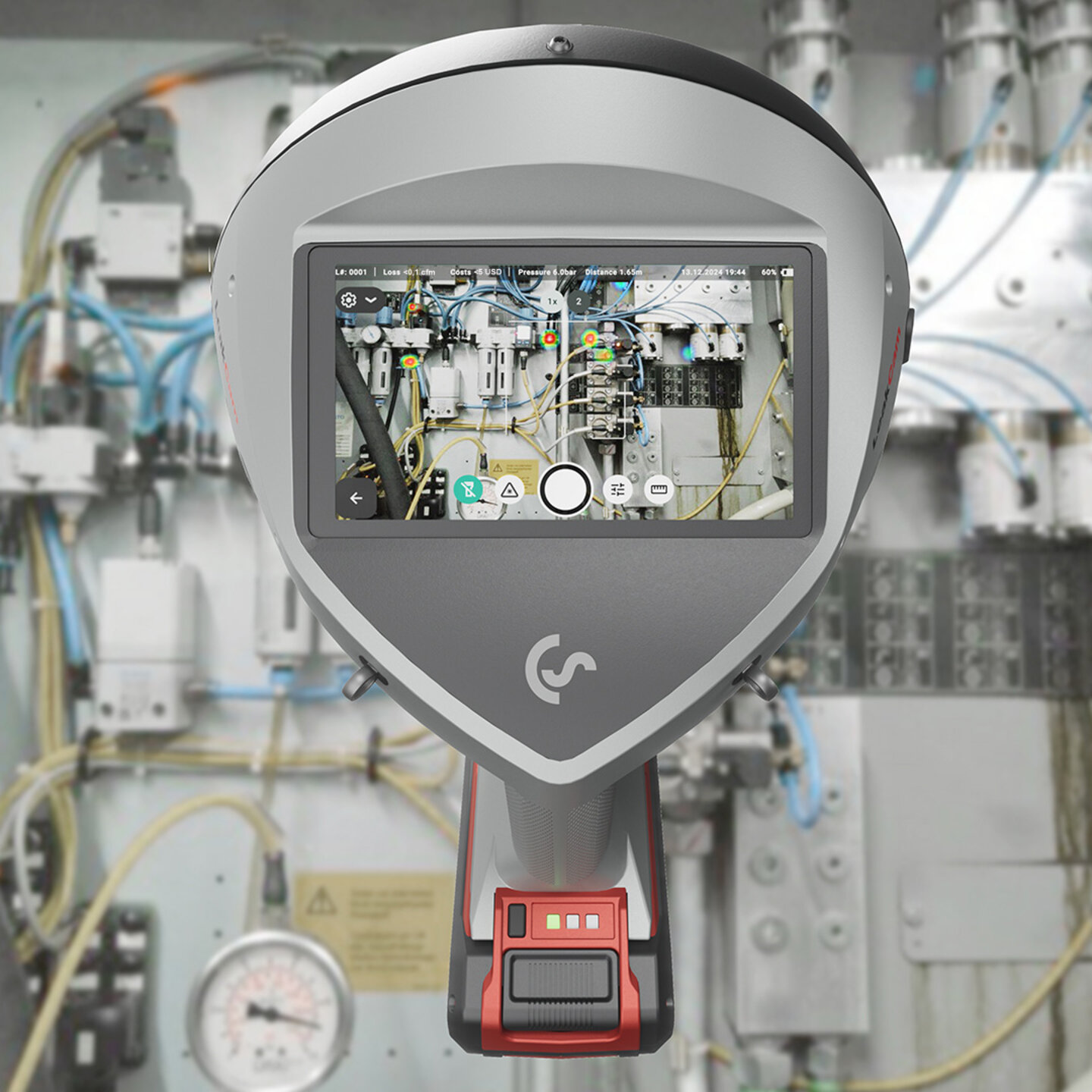 Due to the integrated camera and the available accessories our starter kit for leak detection enables reliable leak detection as well as compressed air leakage calculation and reporting according to ISO 50001.